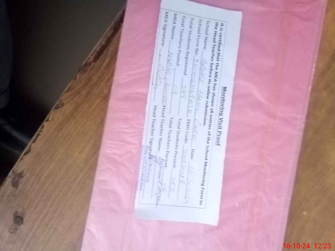 | Attendance Register | Head Teacher | MEA with School | Visit Proof |