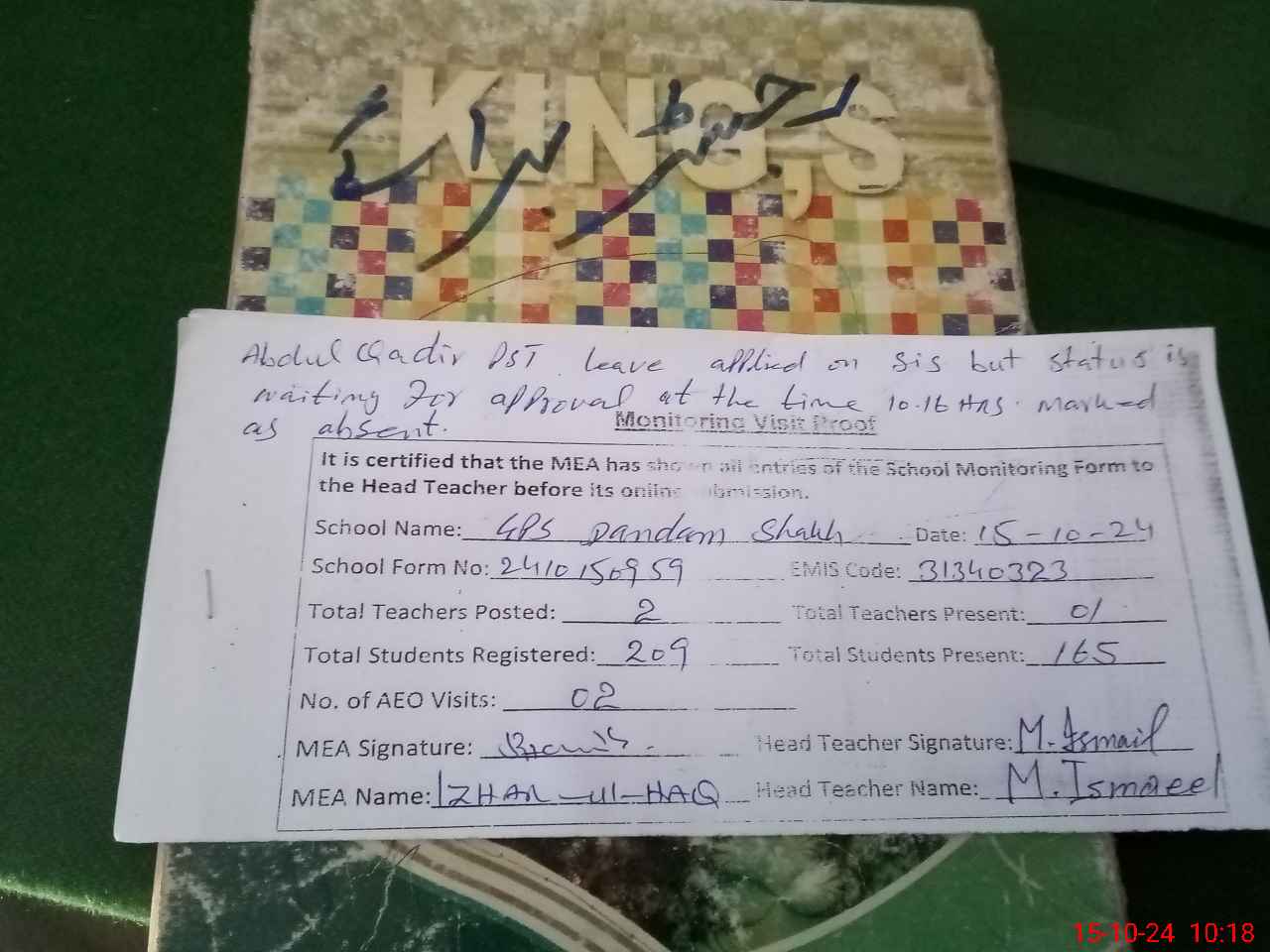 | Attendance Register | Head Teacher | MEA with School | Visit Proof |