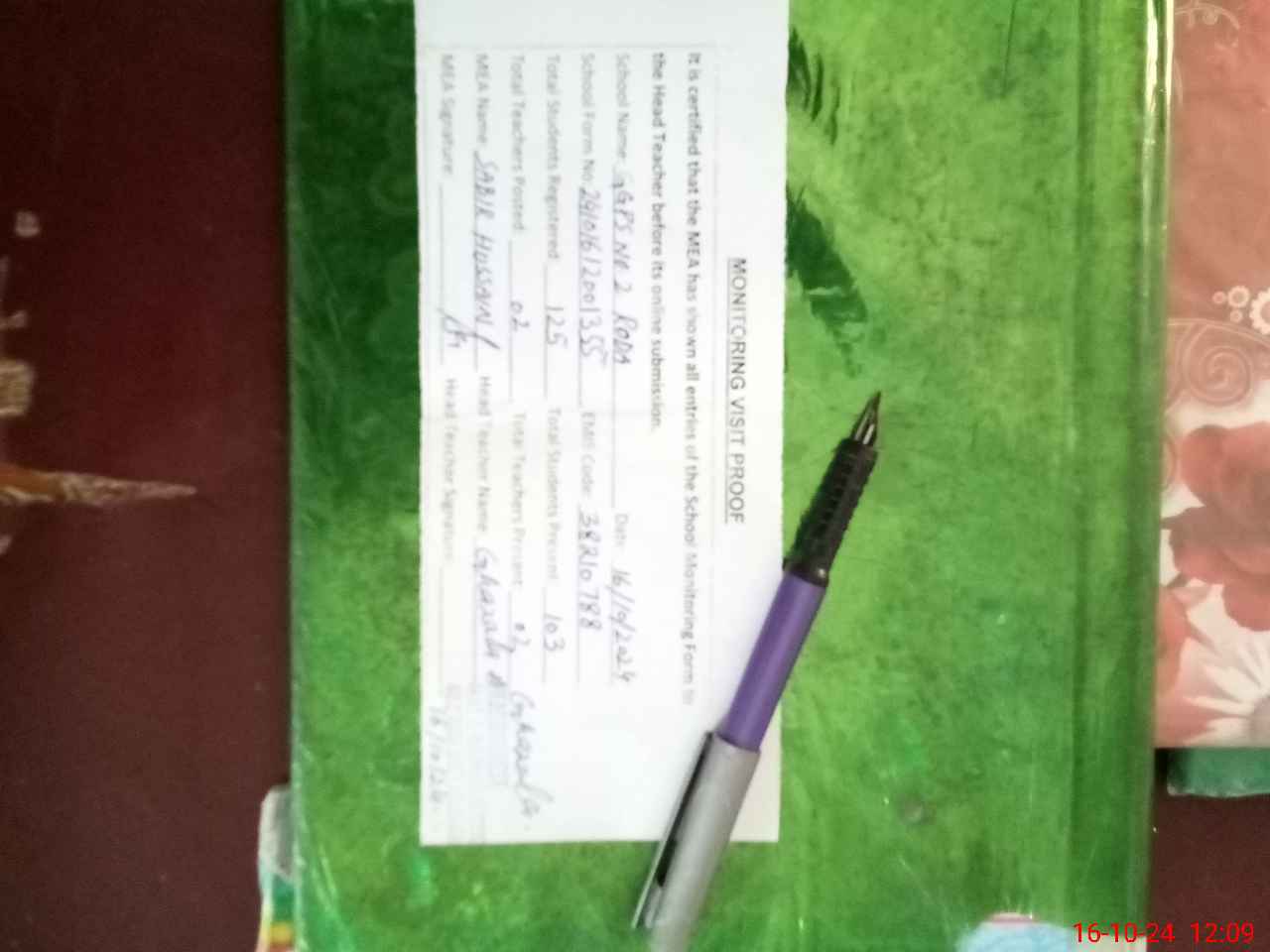 | Attendance Register | Head Teacher | MEA with School | Visit Proof |