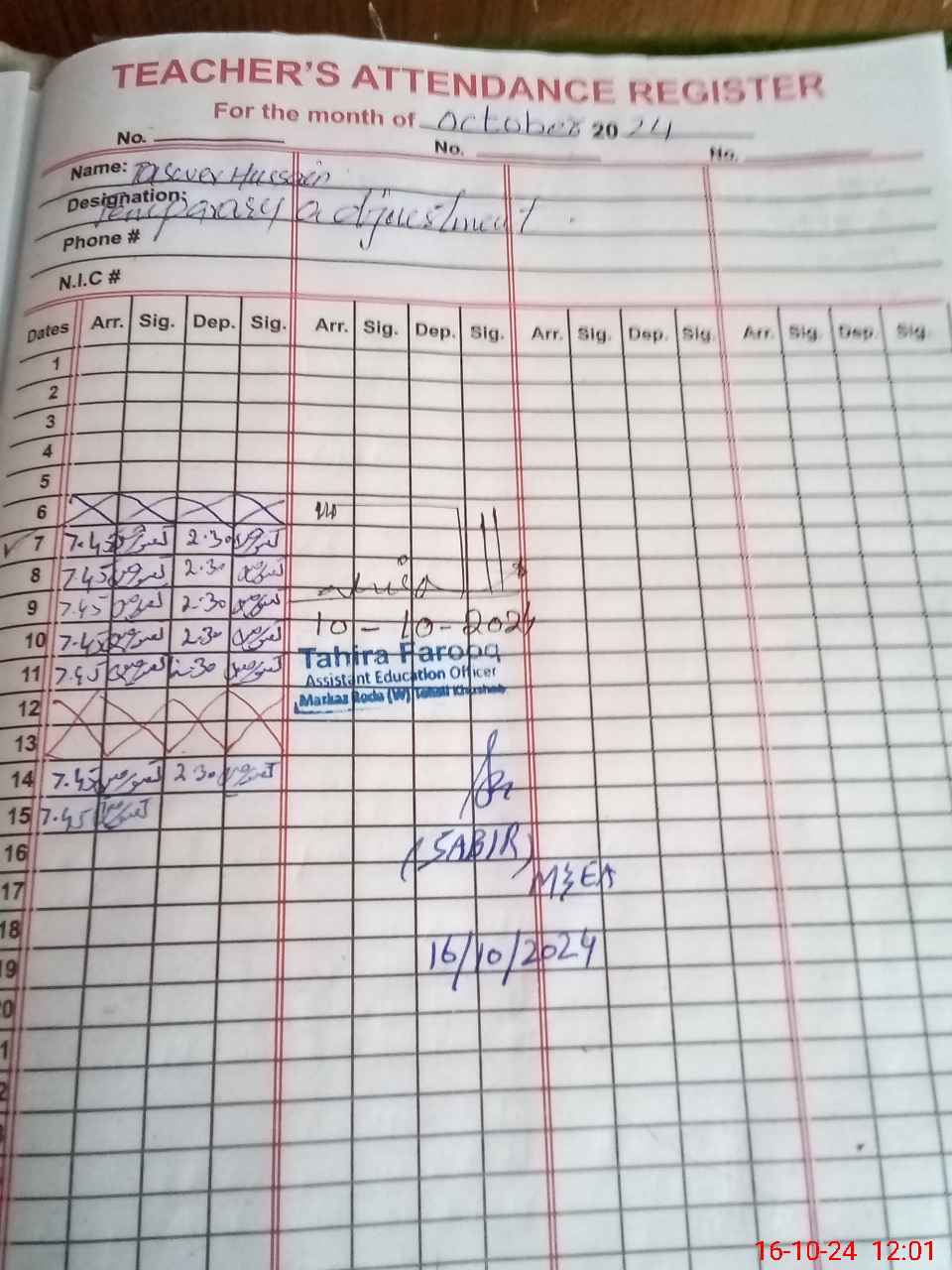 | CNIC | Full Name | Designation | R/C | Absence During Last Calender Month |