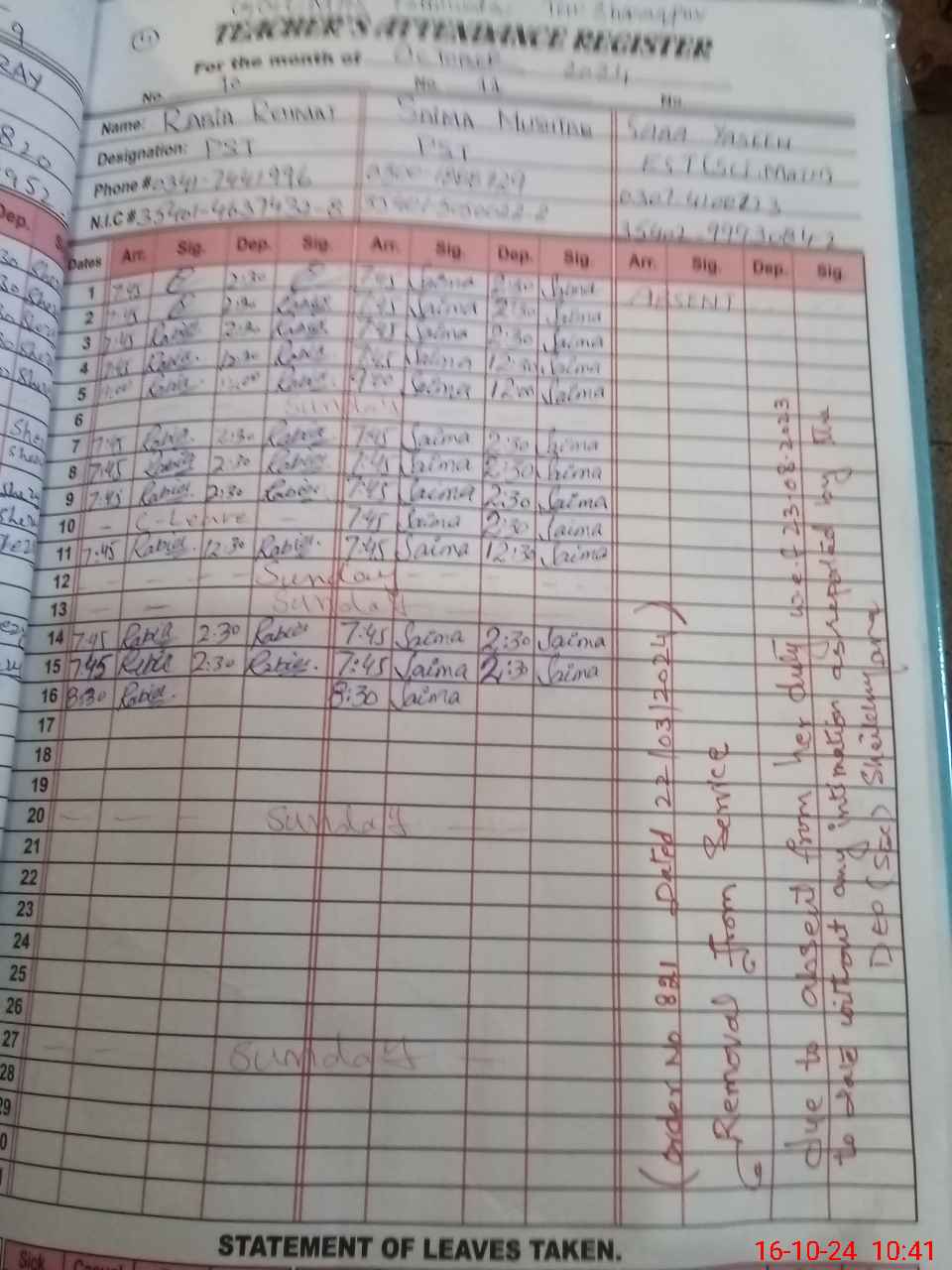 | CNIC | Full Name | Designation | R/C | Absence During Last Calender Month |