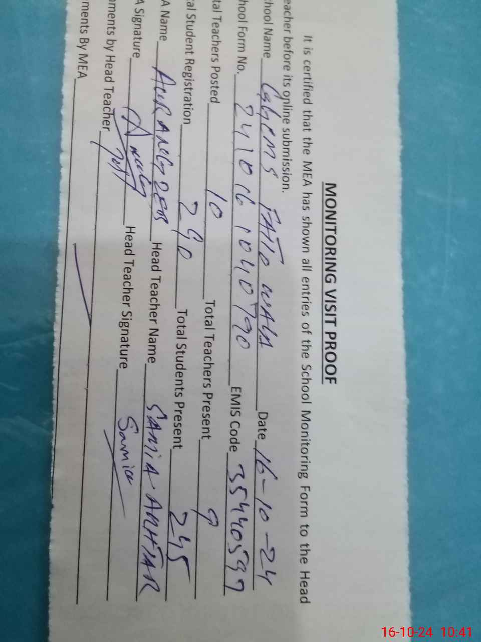 | Attendance Register | Head Teacher | MEA with School | Visit Proof |