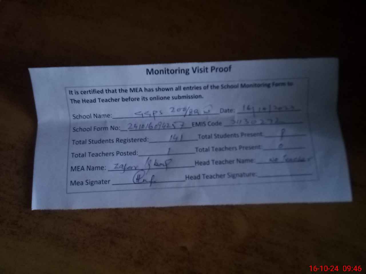 | Attendance Register | Head Teacher | MEA with School | Visit Proof |