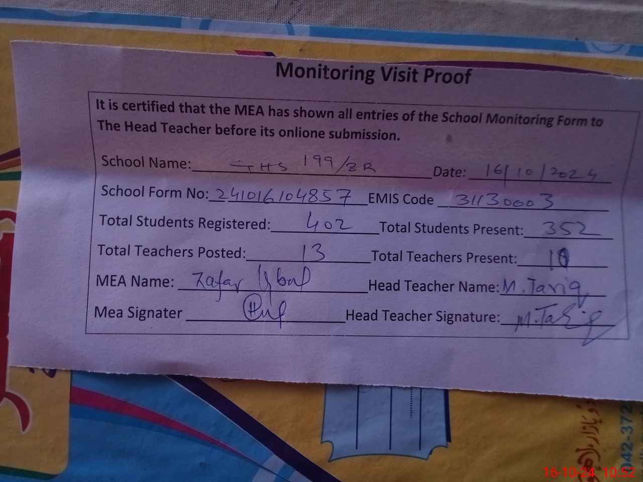 | Certified that this School was Inspected by the Undersigned MEA/DMO Today and the Information Stated Above is as Per Record. | |||||