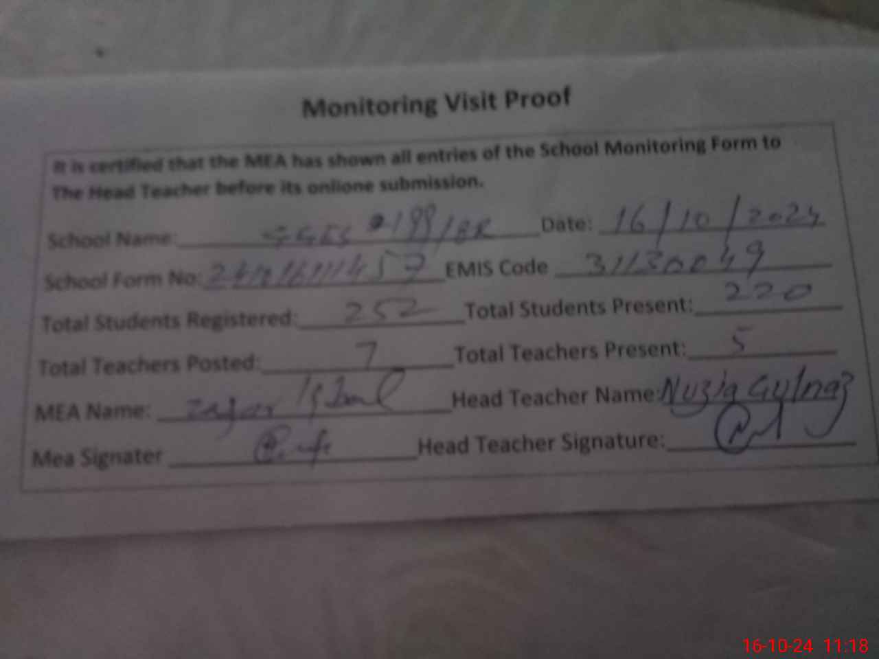 | Attendance Register | Head Teacher | MEA with School | Visit Proof |