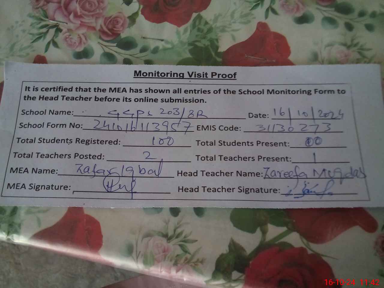 | Attendance Register | Head Teacher | MEA with School | Visit Proof |