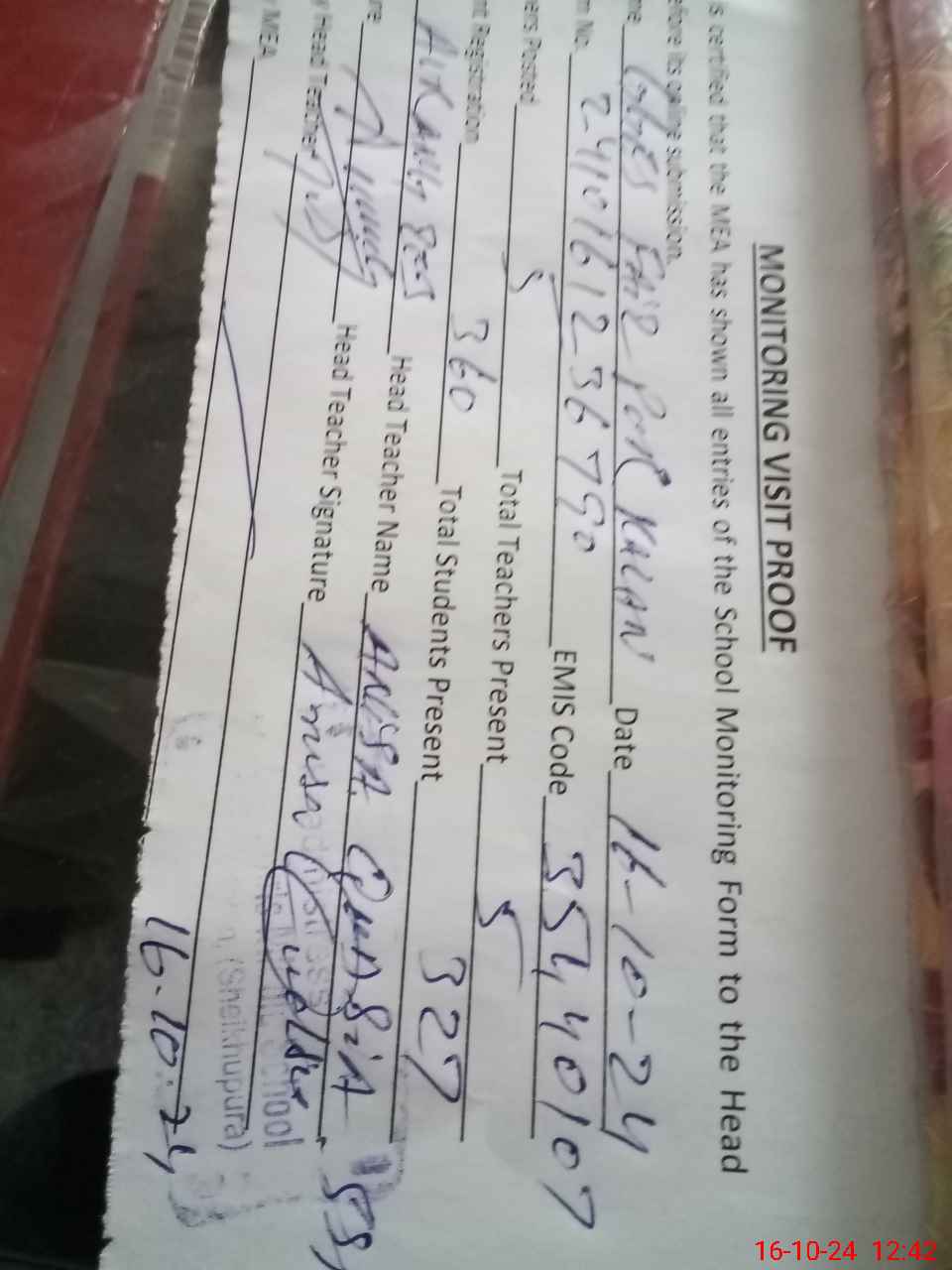 | Attendance Register | Head Teacher | MEA with School | Visit Proof |