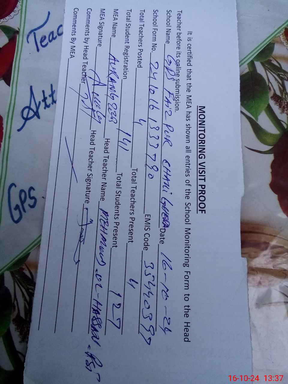 | Attendance Register | Head Teacher | MEA with School | Visit Proof |