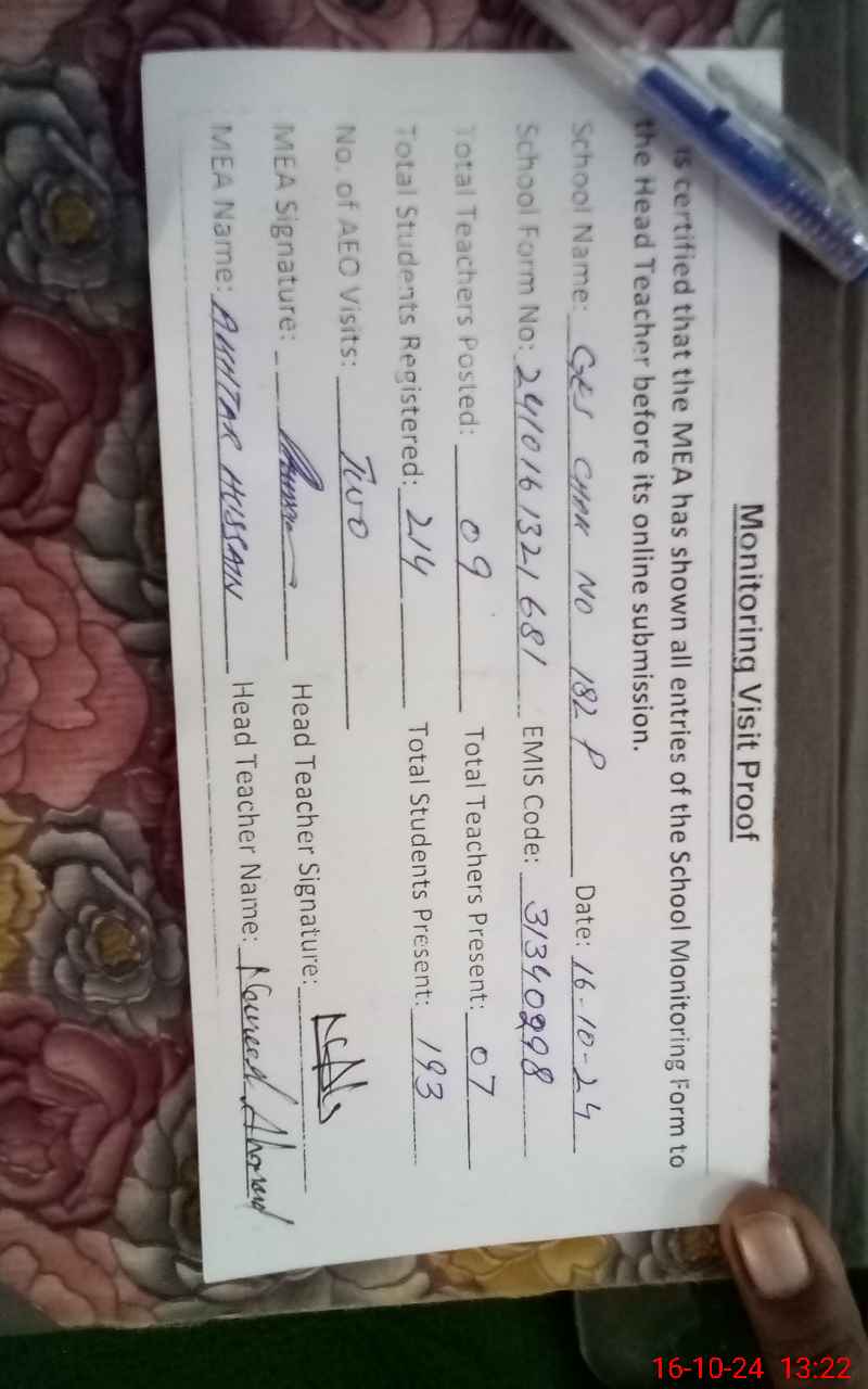 | EMIS Code: 31340298 | Name of School: GES CHAK NO. 182/P | |||