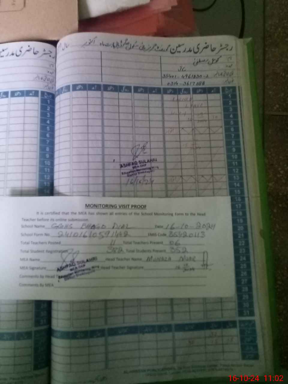 | Attendance Register | Head Teacher | MEA with School | Visit Proof |