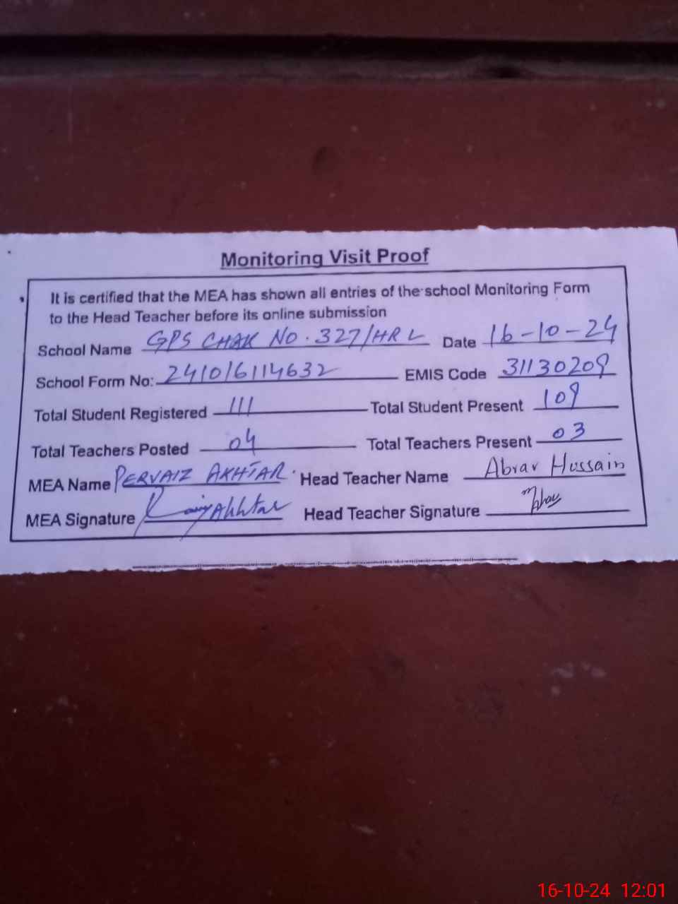 | Attendance Register | Head Teacher | MEA with School | Visit Proof |