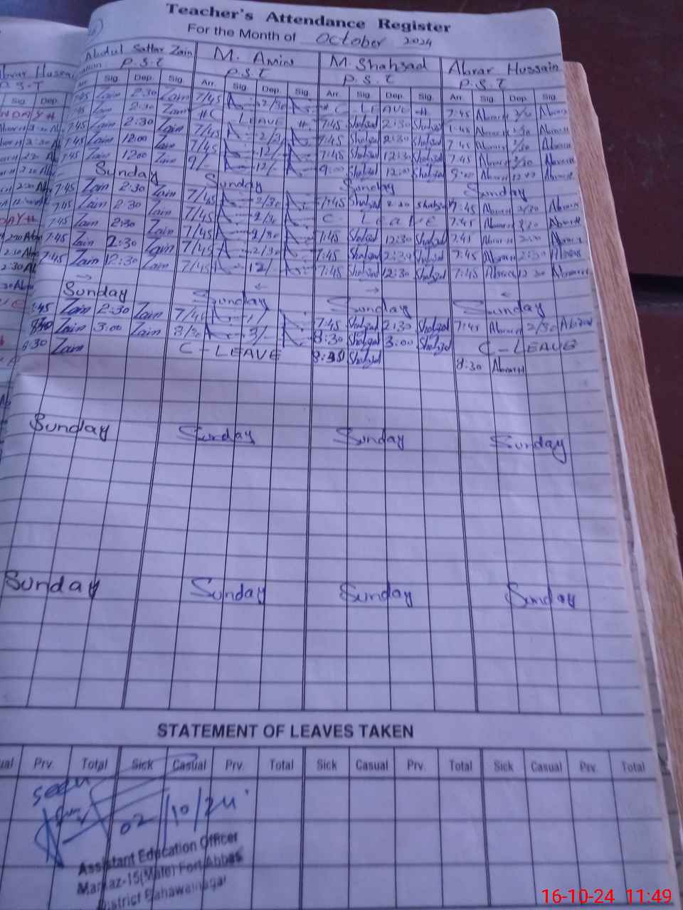 | CNIC | Full Name | Designation | R/C | Absence During Last Calender Month |