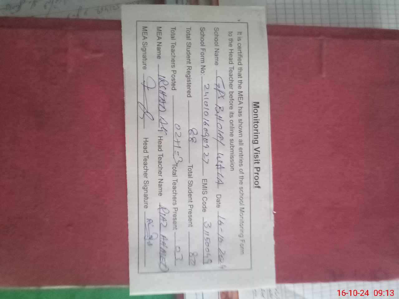 | Attendance Register | Head Teacher | MEA with School | Visit Proof |