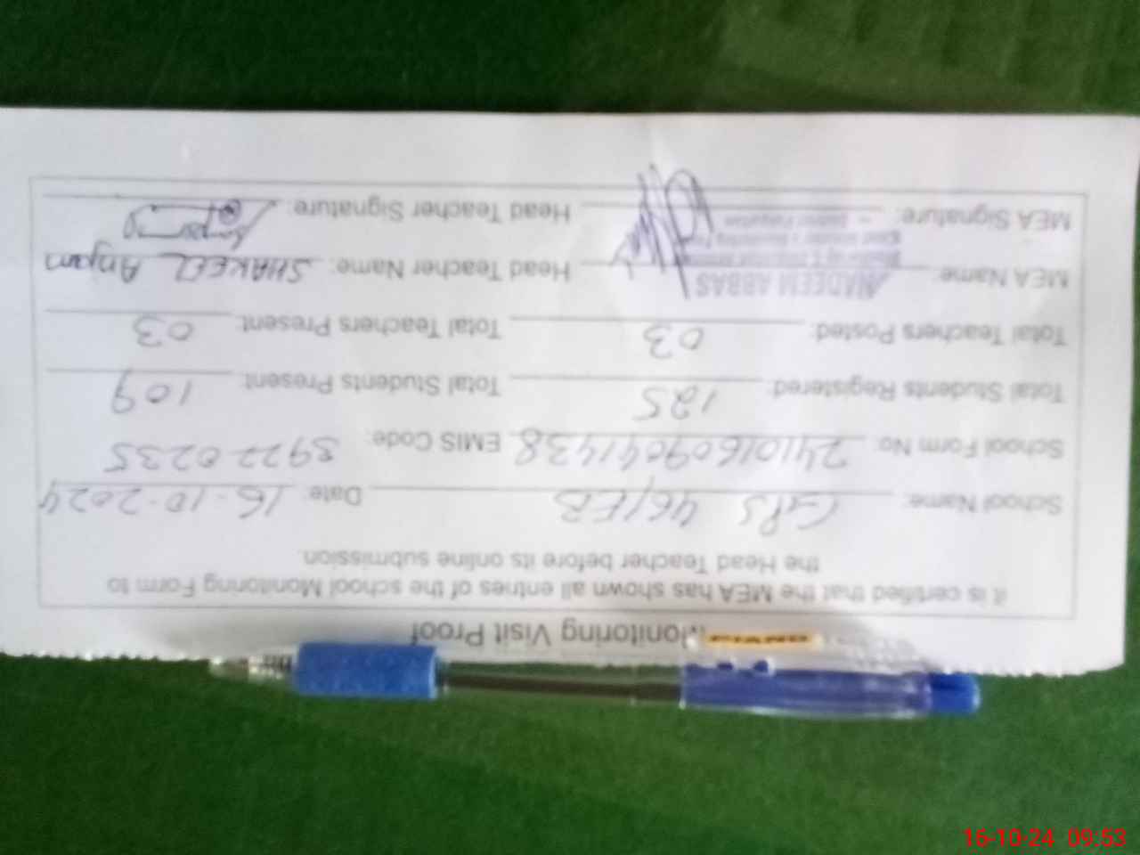 | Certified that this School was Inspected by the Undersigned MEA/DMO Today and the Information Stated Above is as Per Record. | |||||