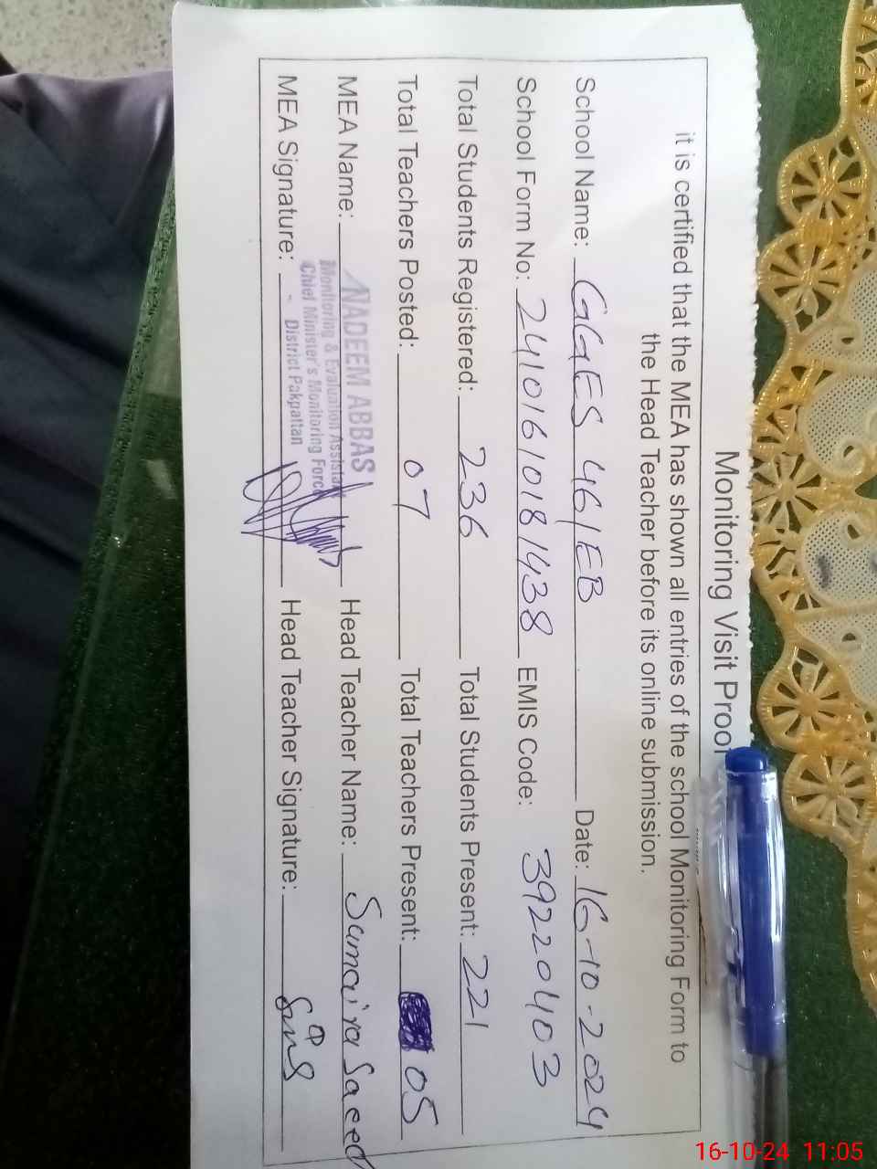 | Certified that this School was Inspected by the Undersigned MEA/DMO Today and the Information Stated Above is as Per Record. | |||||