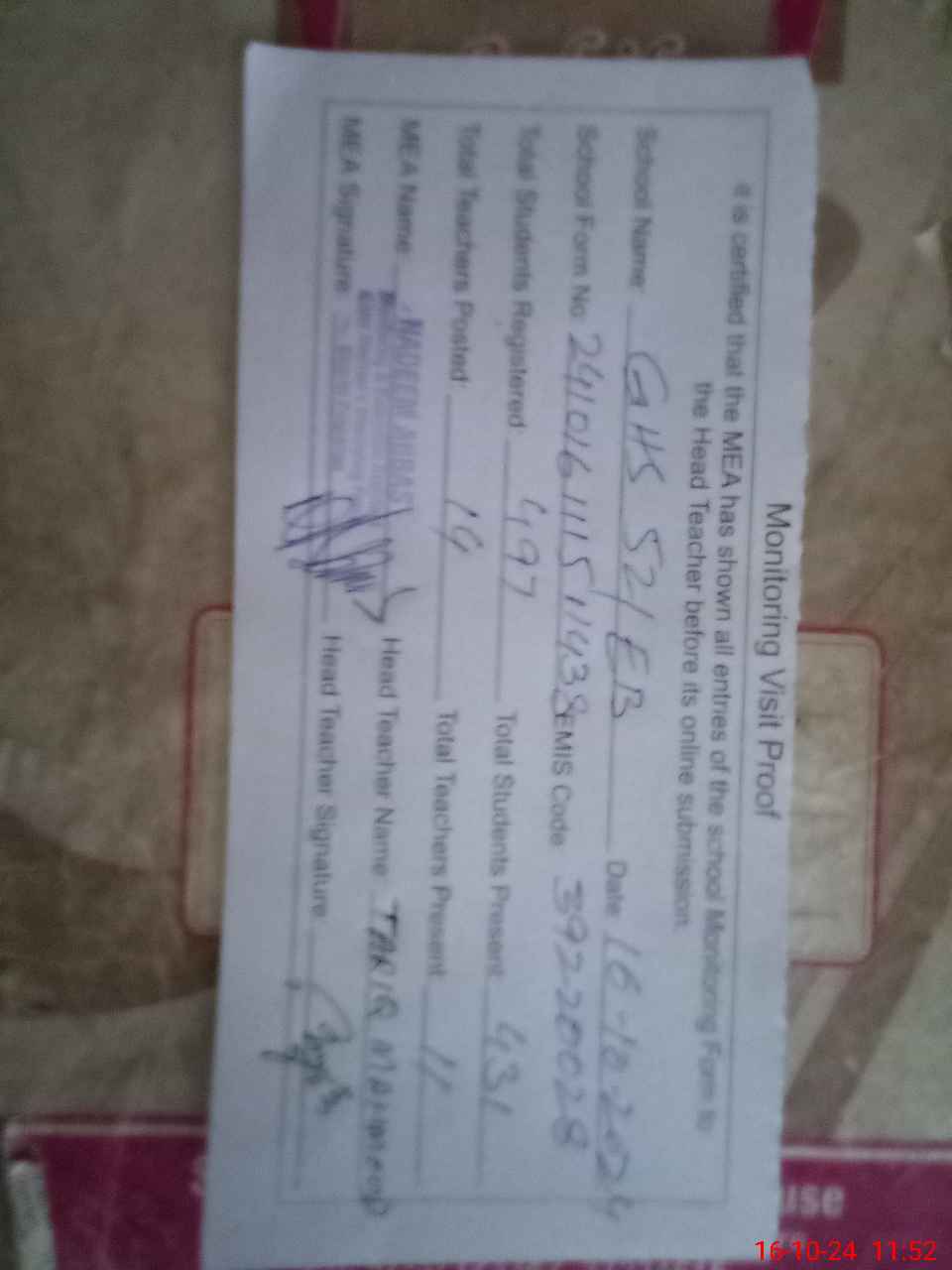 | Certified that this School was Inspected by the Undersigned MEA/DMO Today and the Information Stated Above is as Per Record. | |||||