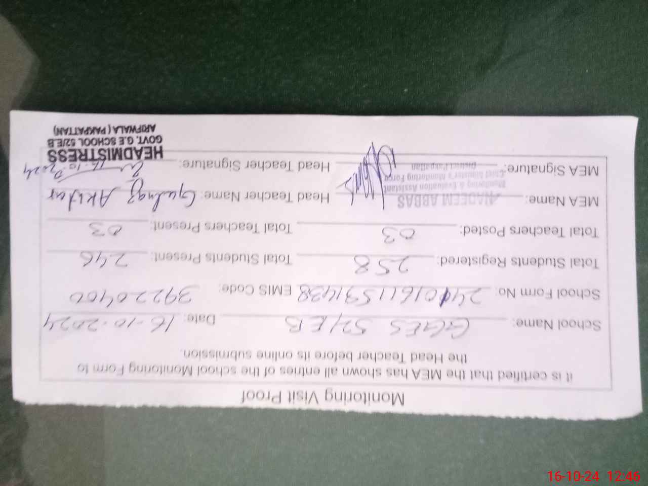 | Certified that this School was Inspected by the Undersigned MEA/DMO Today and the Information Stated Above is as Per Record. | |||||