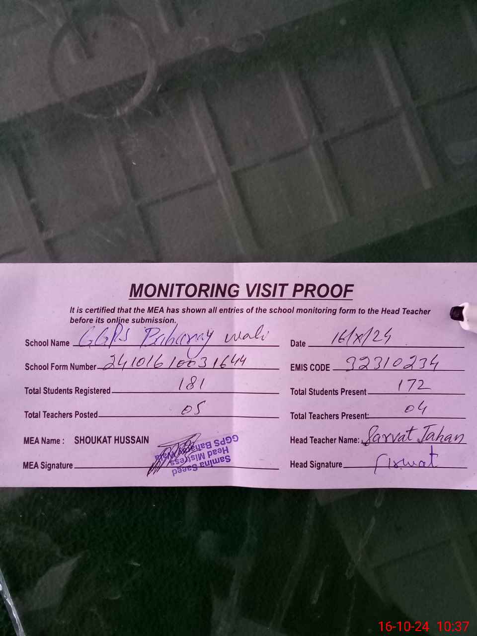 | EMIS Code: 32310234 | Name of School: GGPS BAHARAY WALA | |||