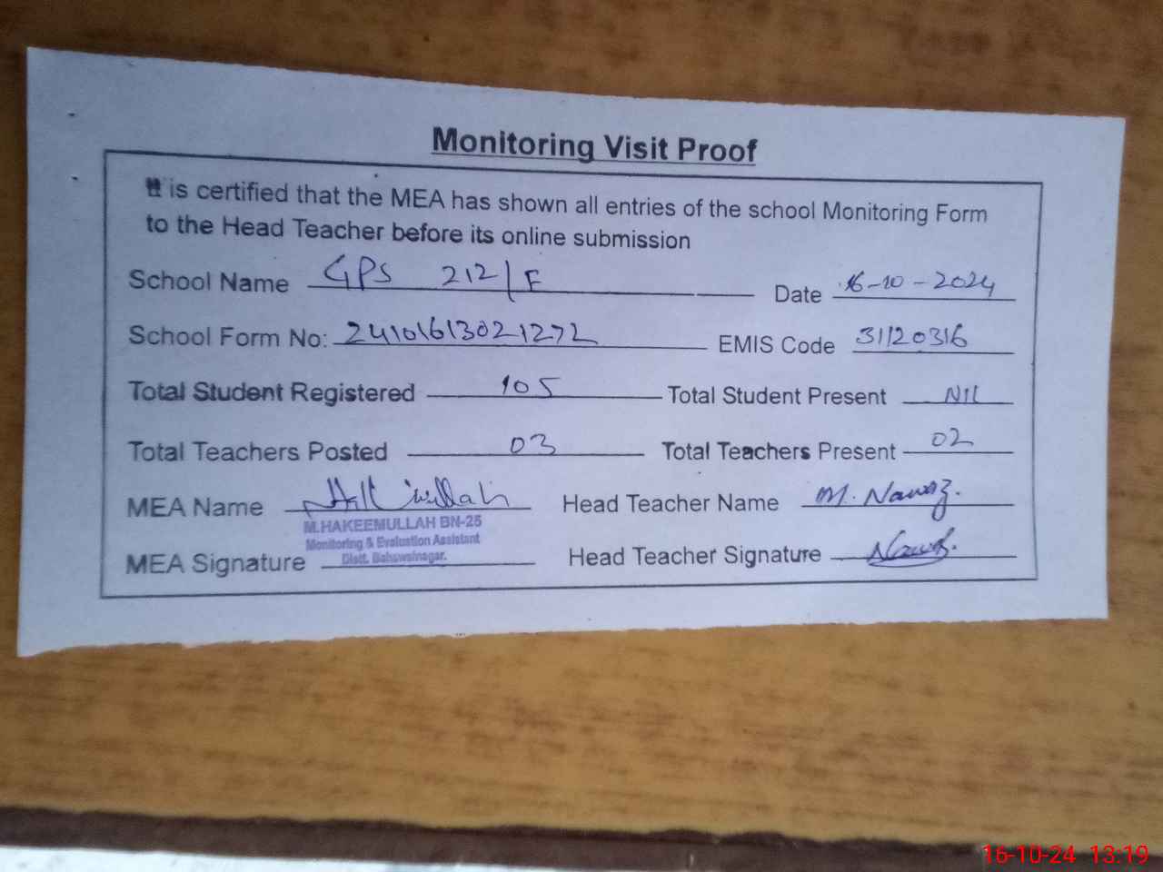 | Attendance Register | Head Teacher | MEA with School | Visit Proof |