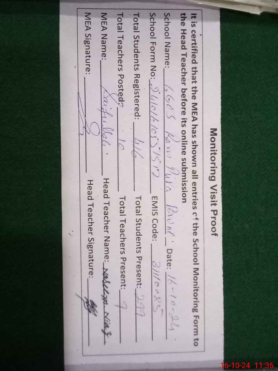 | Attendance Register | Head Teacher | MEA with School | Visit Proof |