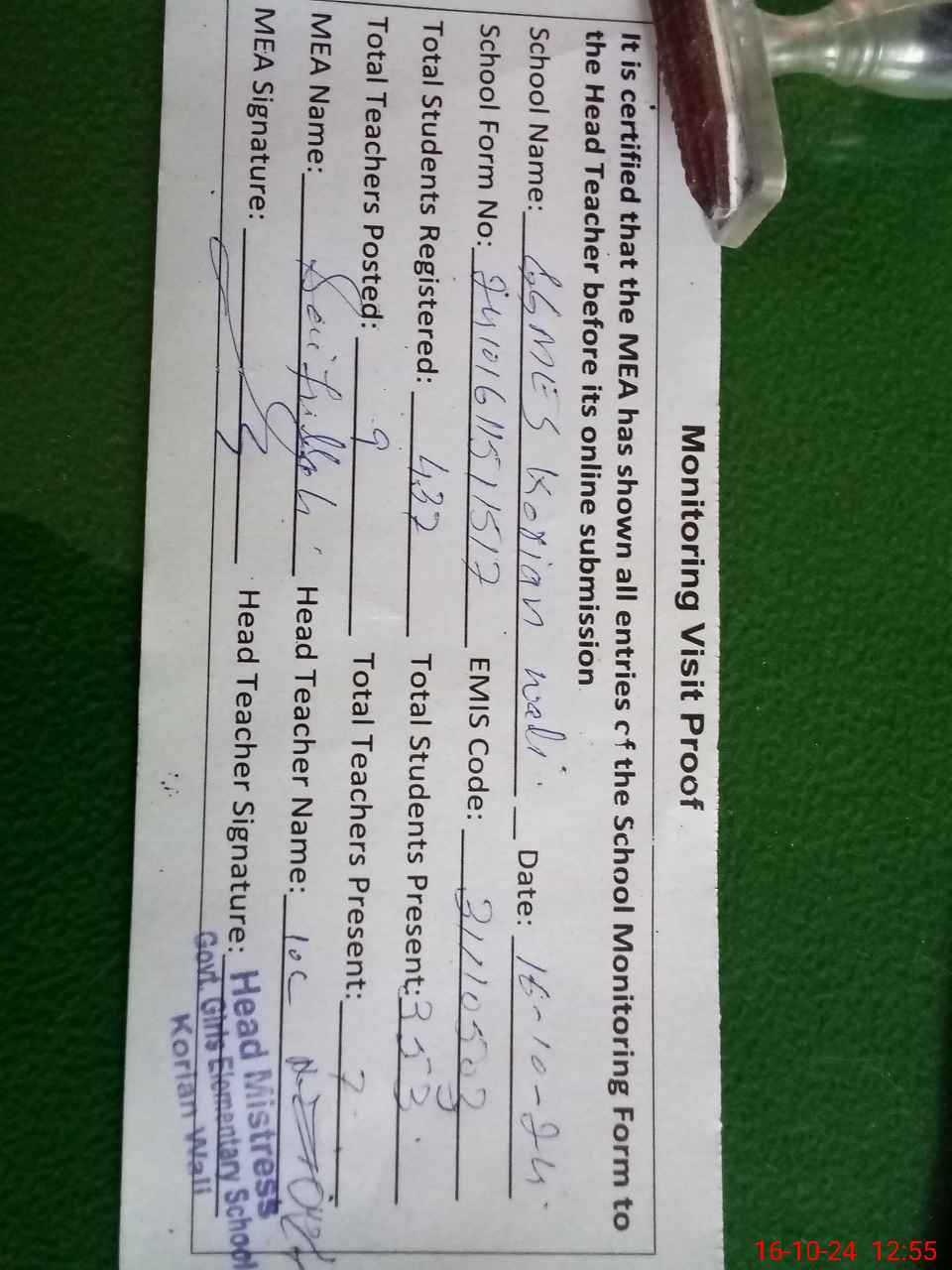 | Certified that this School was Inspected by the Undersigned MEA/DMO Today and the Information Stated Above is as Per Record. | |||||