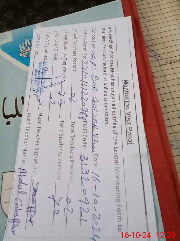 | Attendance Register | Head Teacher | MEA with School | Visit Proof |