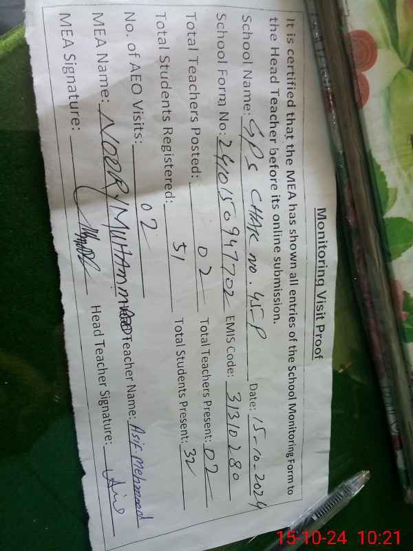 | Attendance Register | Head Teacher | MEA with School | Visit Proof |