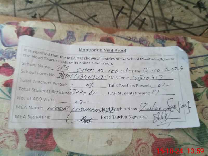 | EMIS Code: 31310317 | Name of School: GPS CHAK NO. 100/1-L | |||