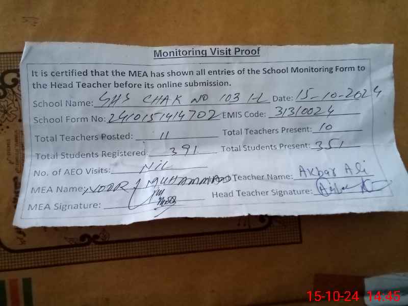 | EMIS Code: 31310024 | Name of School: GHS CHAK 103/1-L | |||