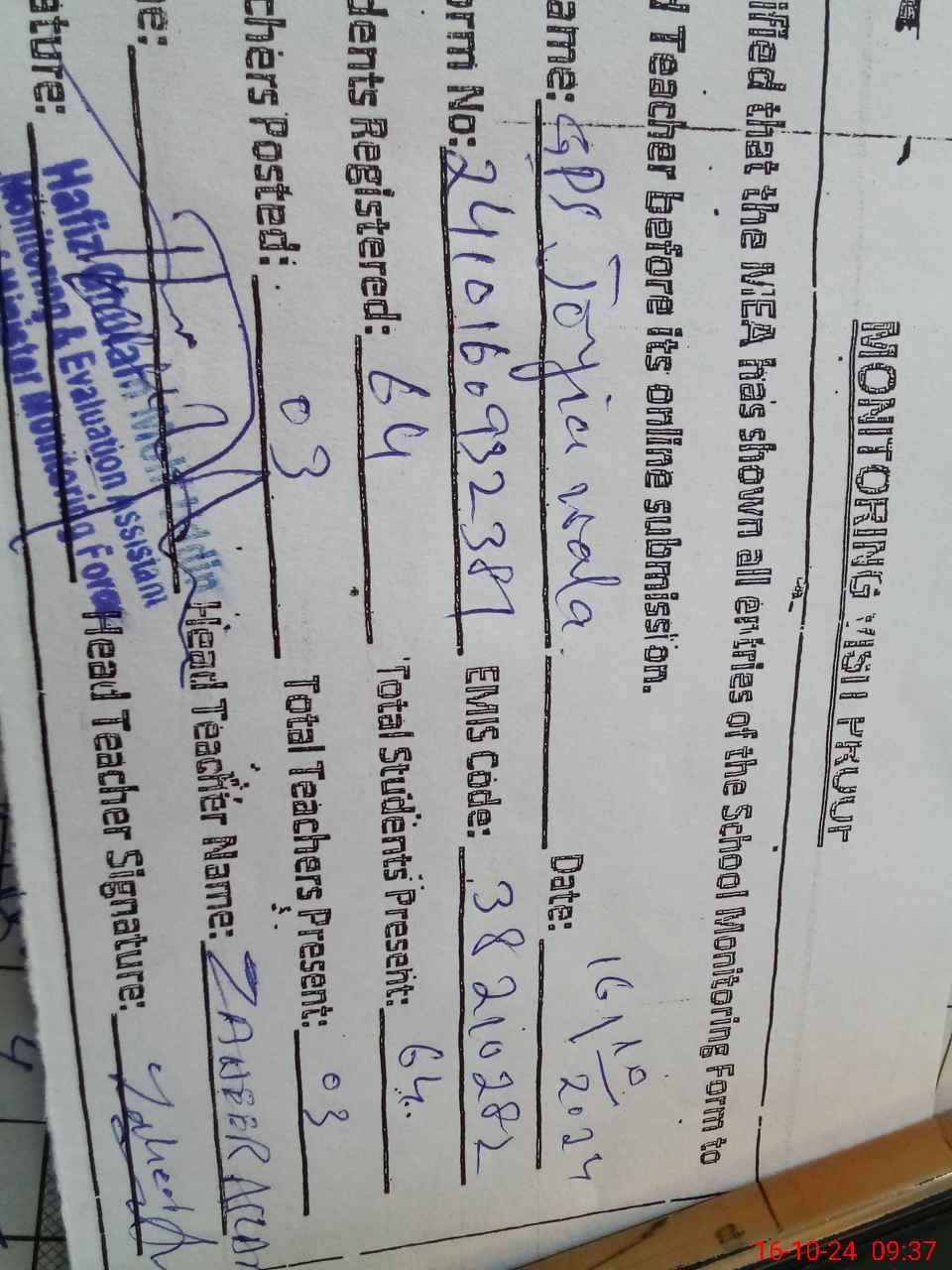 | Name: Ah**** Iq**** Designation: (School Headmaster's/Headmistress's) PST Phone/Cell Number: 03**** |