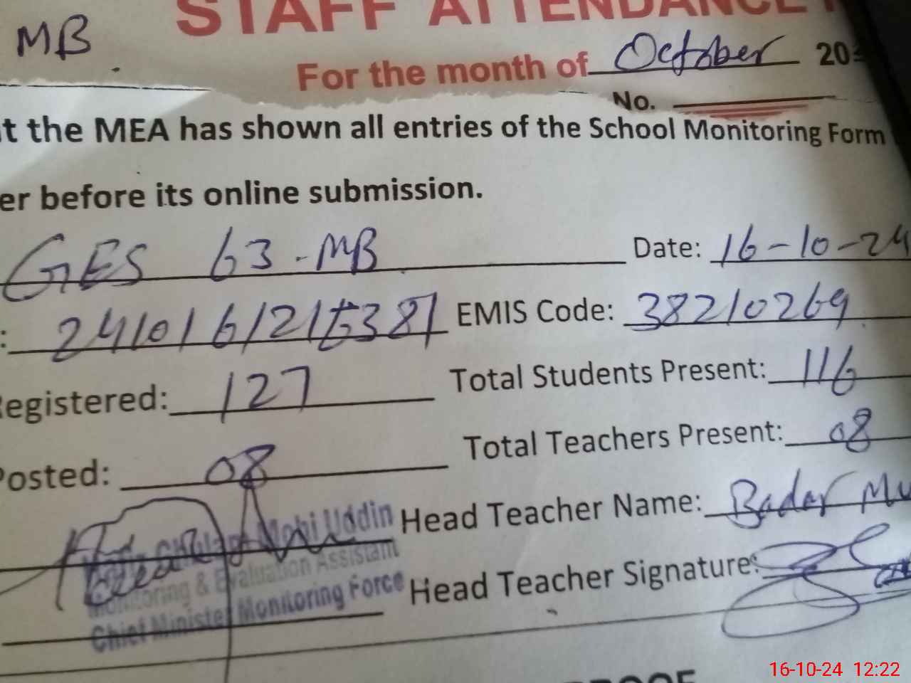 | Attendance Register | Head Teacher | MEA with School | Visit Proof |