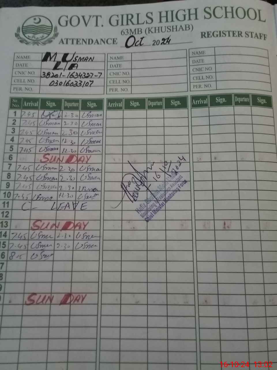 | CNIC | Full Name | Designation | R/C | Absence during last cal. month |