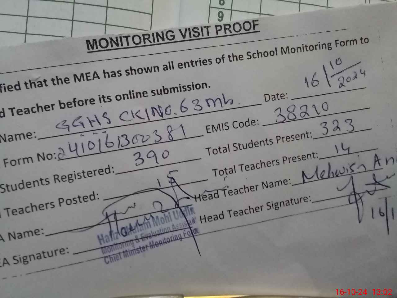| Attendance Register | Head Teacher | MEA with School | Visit Proof |