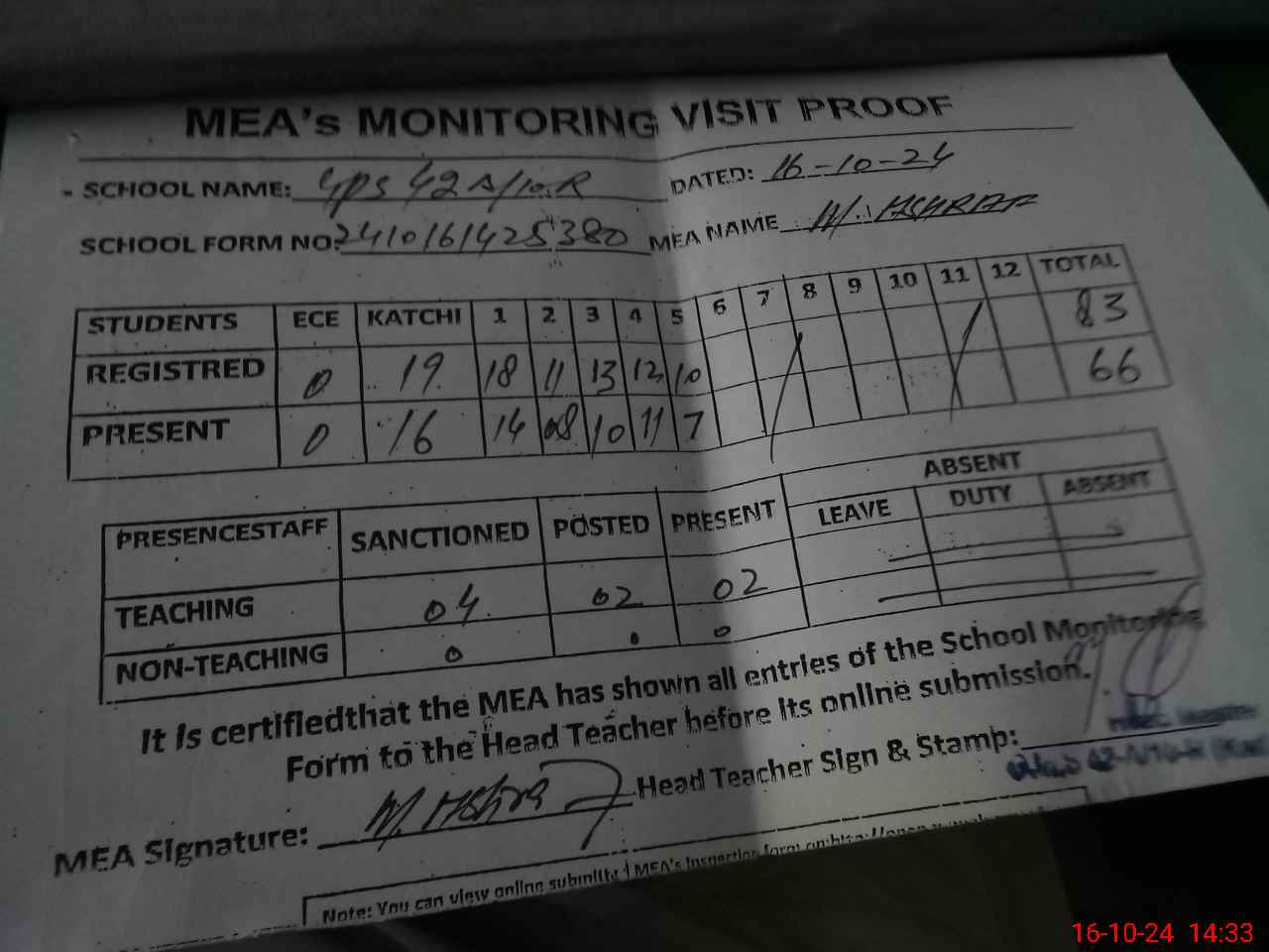 | Attendance Register | Head Teacher | MEA with School | Visit Proof |