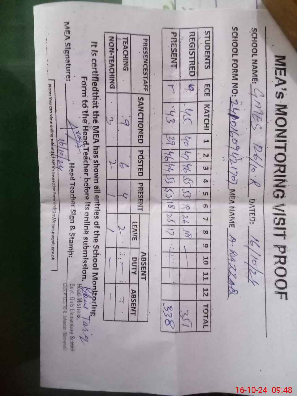 | Certified that this School was Inspected by the Undersigned MEA/DMO Today and the Information Stated Above is as Per Record. | |||||