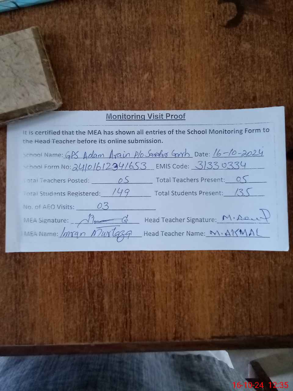 | EMIS Code: 31330334 | Name of School: GPS ADAM ARAIN PO SARDAR GARH | |||
