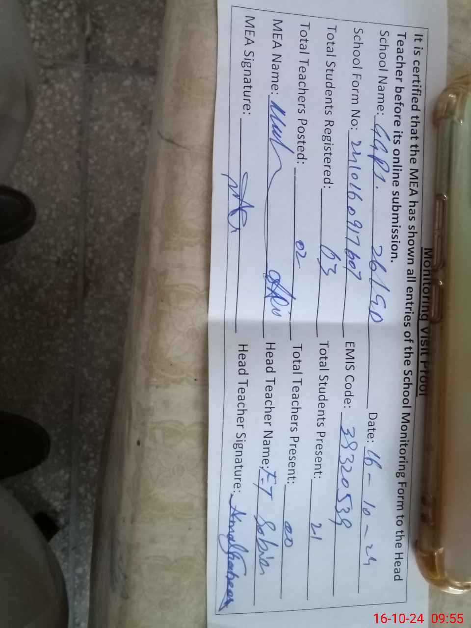 | Attendance Register | Head Teacher | MEA with School | Visit Proof |