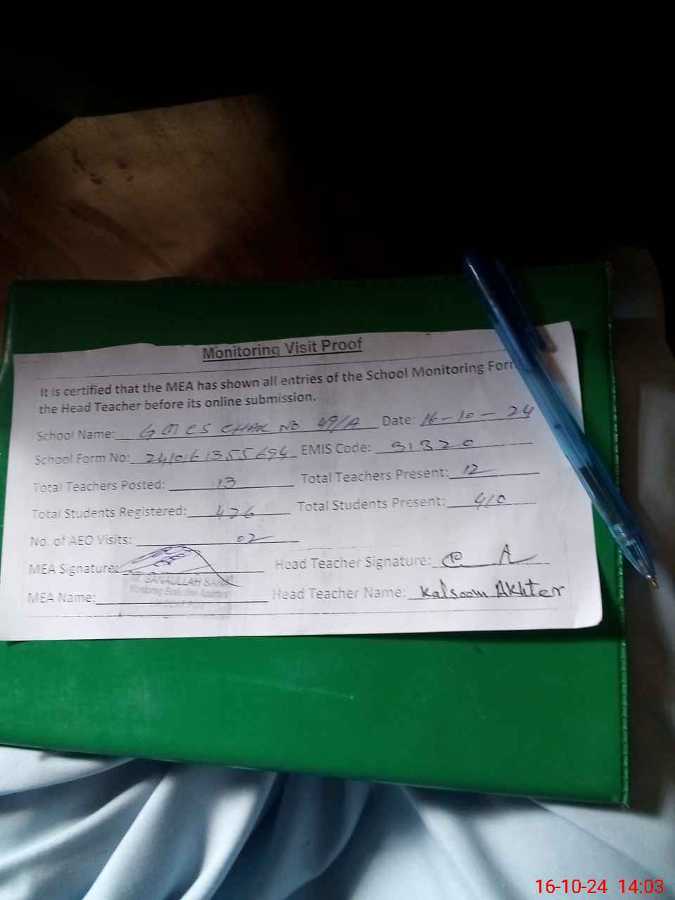 | Attendance Register | Head Teacher | MEA with School | Visit Proof |