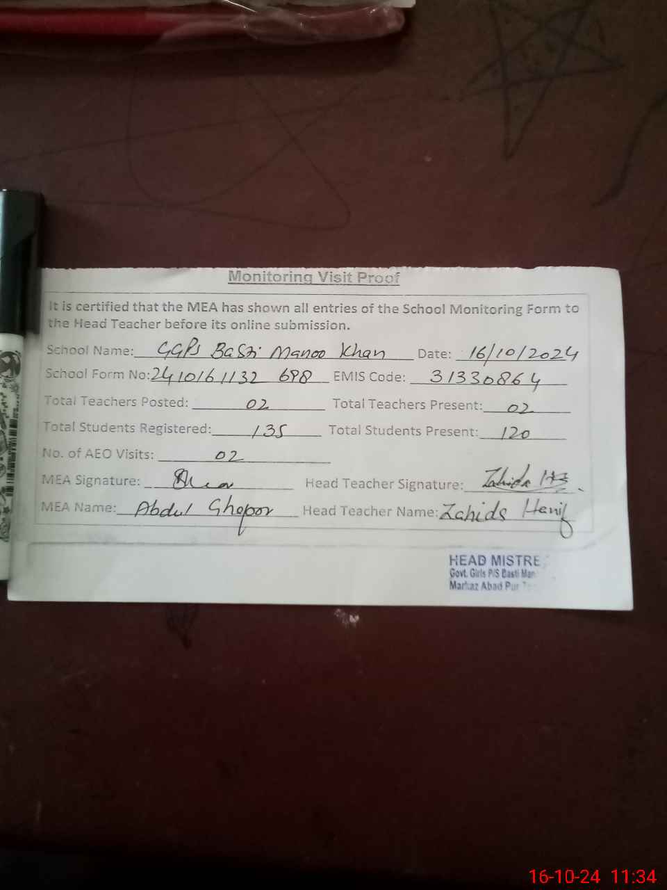 | Certified that this School was Inspected by the Undersigned MEA/DMO Today and the Information Stated Above is as Per Record. | |||||