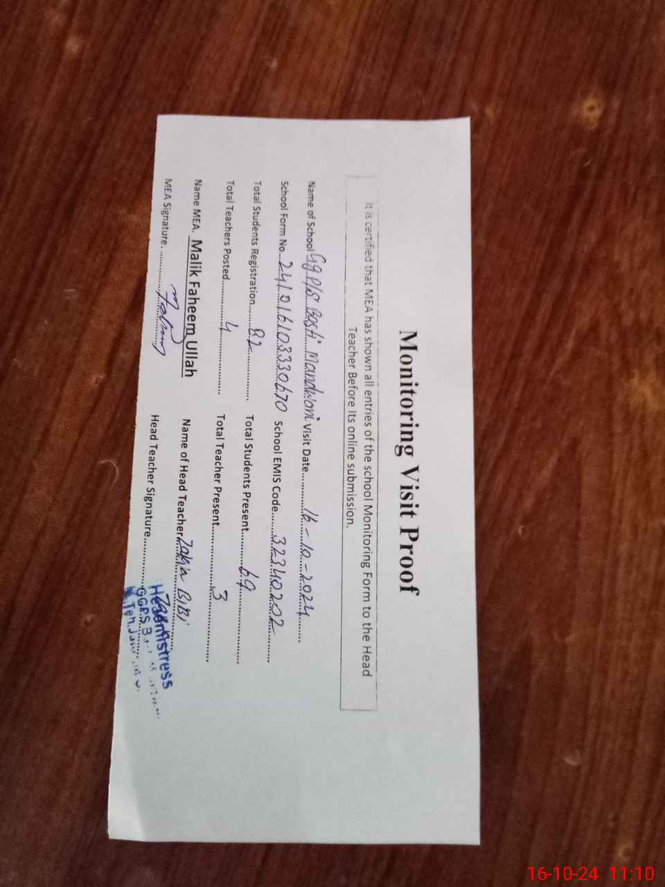 | Certified that this School was Inspected by the Undersigned MEA/DMO Today and the Information Stated Above is as Per Record. | |||||