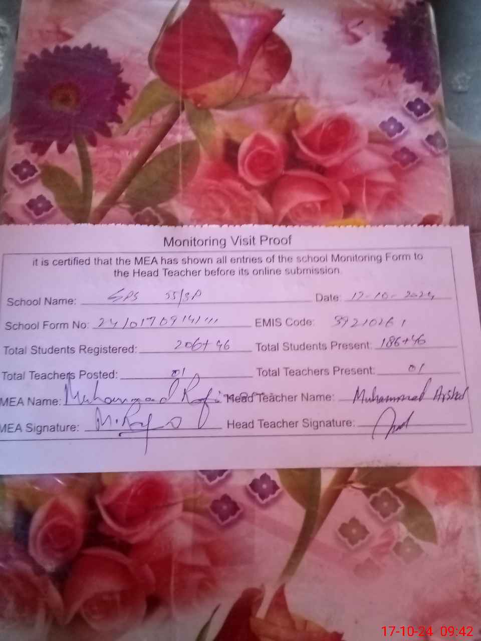| Attendance Register | Head Teacher | MEA with School | Visit Proof |