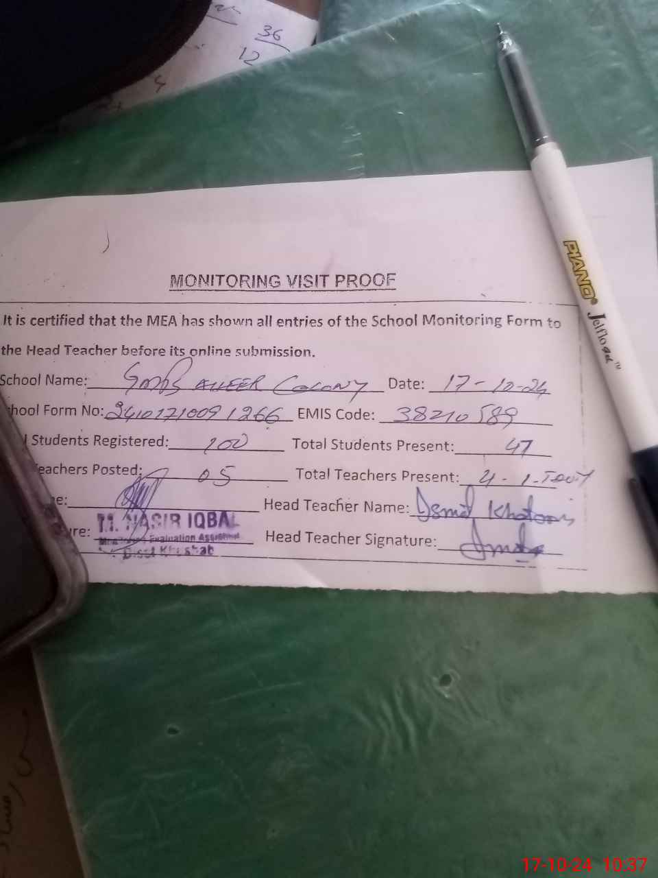 | Attendance Register | Head Teacher | MEA with School | Visit Proof |