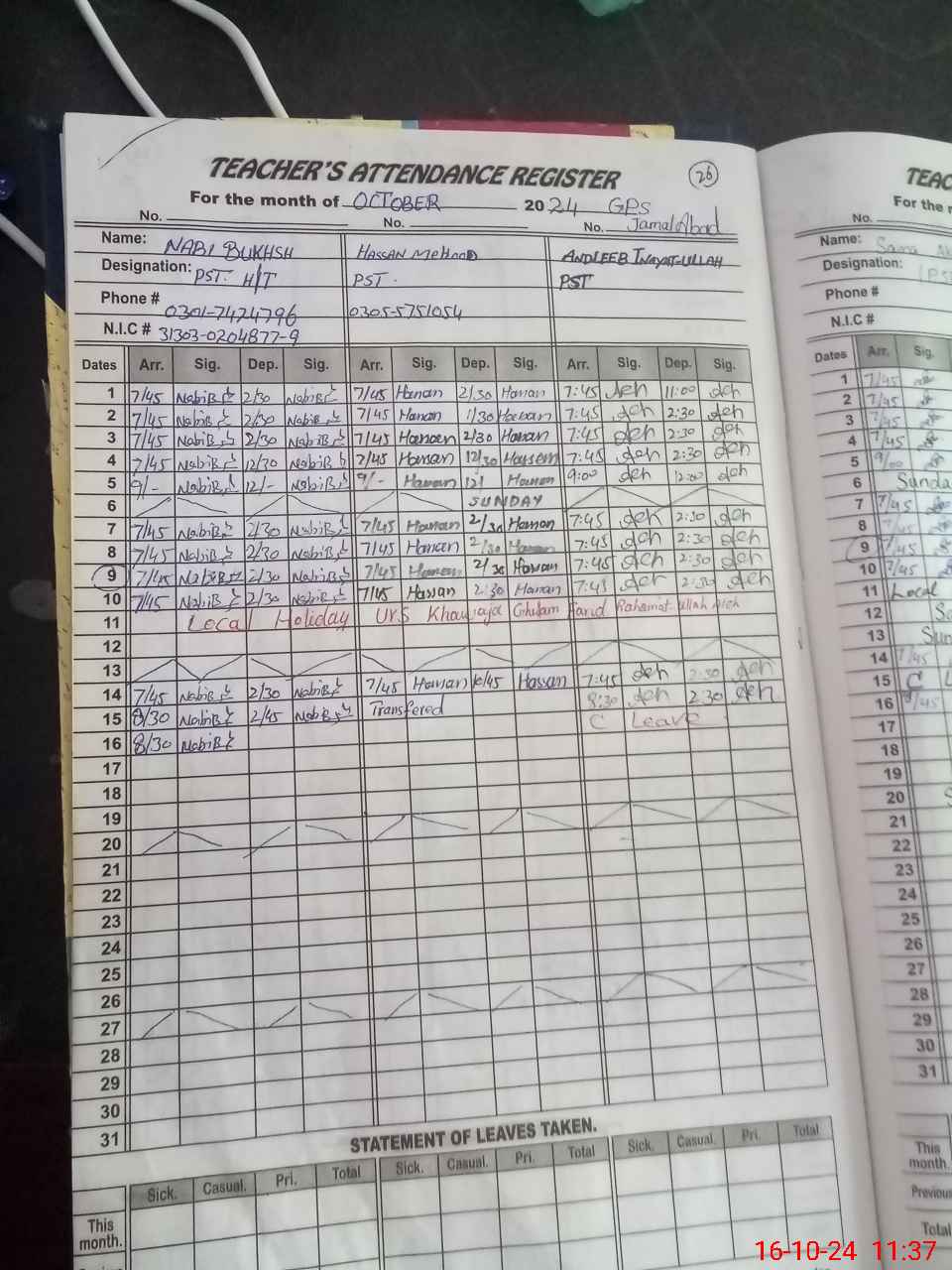 | CNIC | Full Name | Designation | R/C | Absence during last cal. month |
