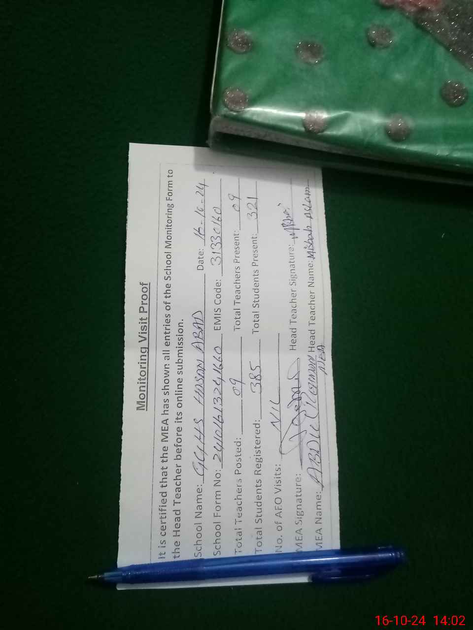 | Certified that this School was Inspected by the Undersigned MEA/DMO Today and the Information Stated Above is as Per Record. | |||||