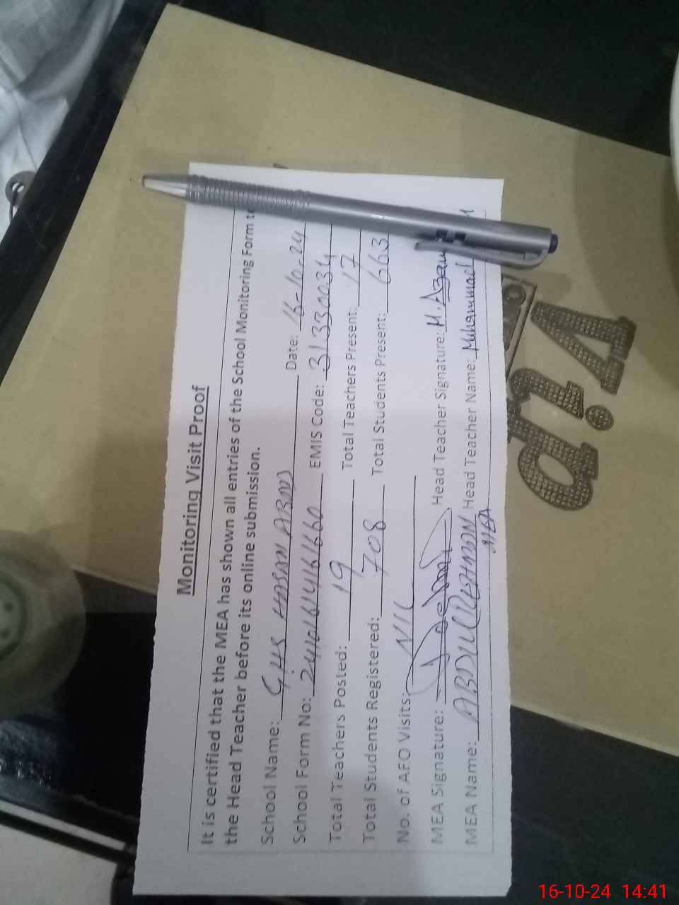 | Attendance Register | Head Teacher | MEA with School | Visit Proof |