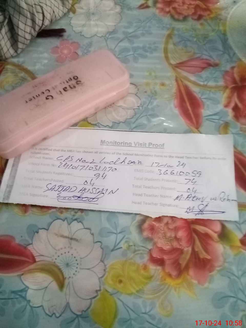 | Attendance Register | Head Teacher | MEA with School | Visit Proof |