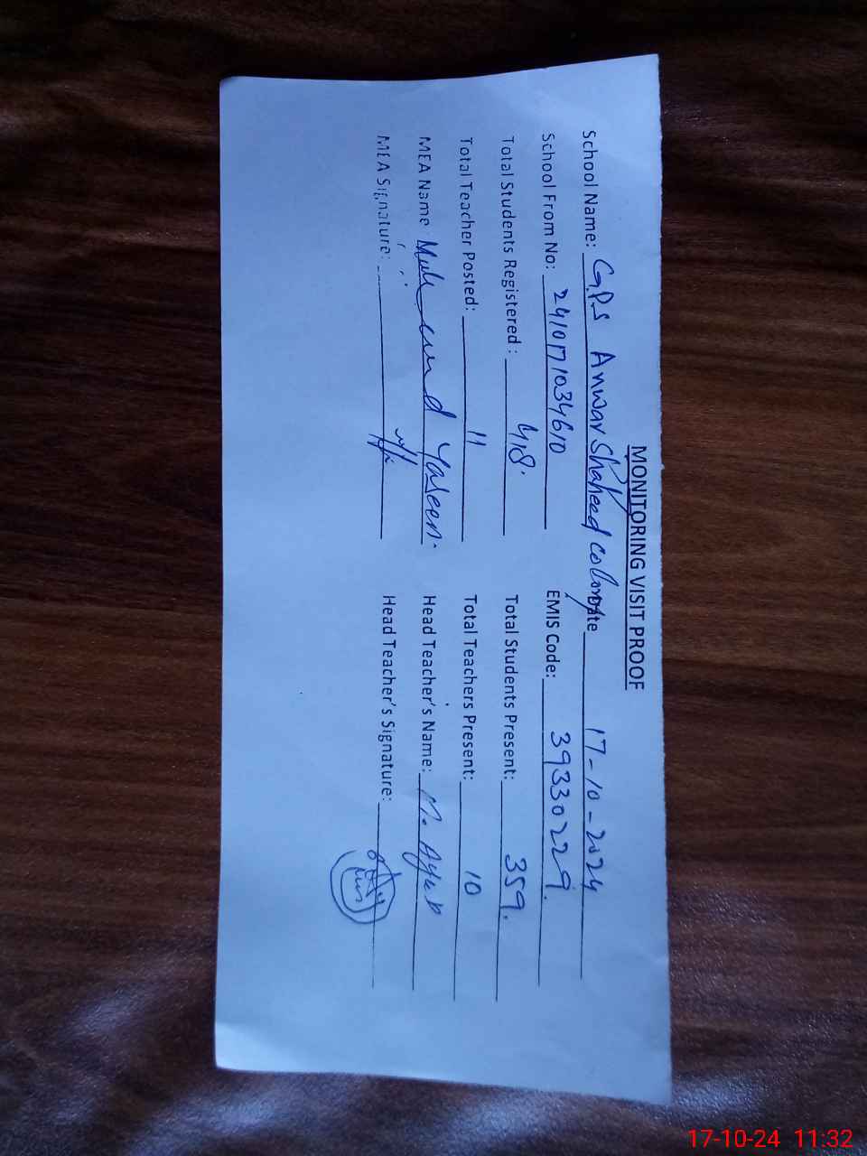| EMIS Code: 39330229 | Name of School: GPS ANWAR SHAHEED COLONY | |||