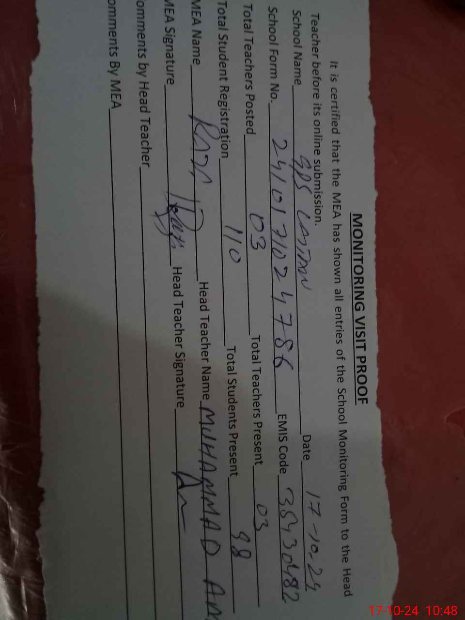 | Certified that this School was Inspected by the Undersigned MEA/DMO Today and the Information Stated Above is as Per Record. | |||||