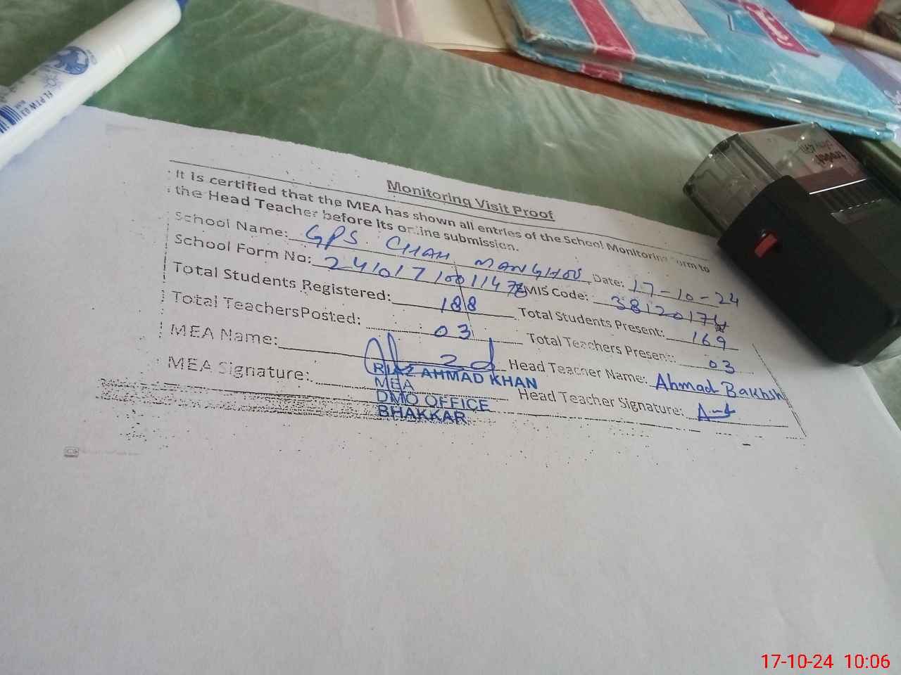 | Certified that this School was Inspected by the Undersigned MEA/DMO Today and the Information Stated Above is as Per Record. | |||||