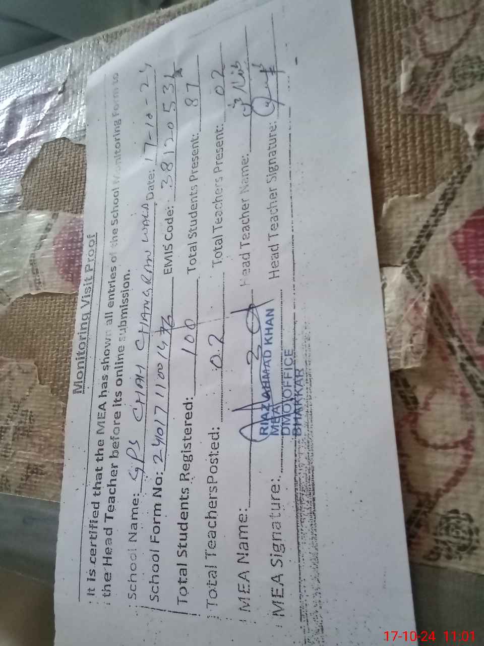 | Name: MU**** IR**** Designation: (School Headmaster's/Headmistress's) ESE Phone/Cell Number: 03**** |